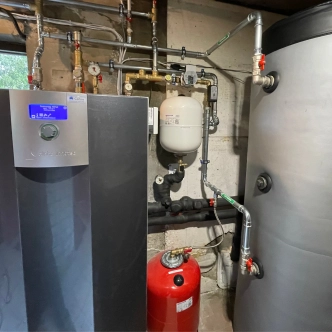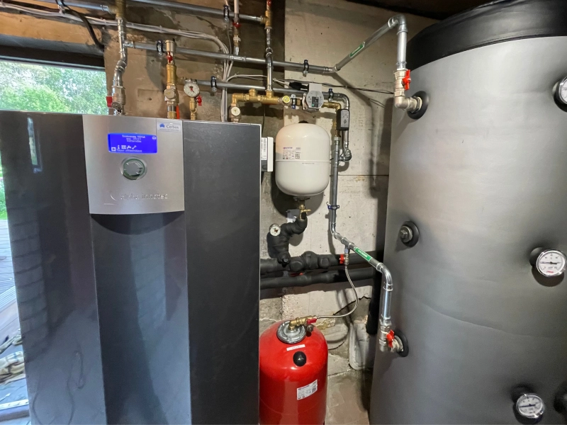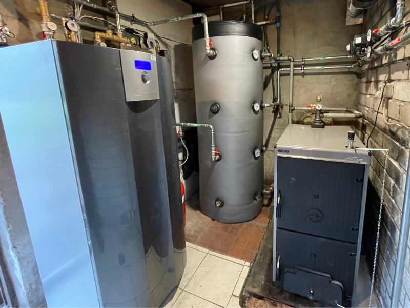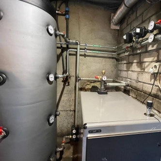 Cerbos paigaldas kliendile täisautomaatse küttesüsteemi, kus on ühendatud maasoojuspump, tahkeküttekatel ja soojaveeboiler. Süsteem töötab täielikult automaatselt – klient ei pea ühtegi kraani keerama. Paigaldatud seadmed: Maasoojuspump: Alpha-Innotec SWC 92 V-line 2–9 kW 3F Boiler soojuspumbale: 200 L, soojusvaheti 2,07 m² + elektriline küttekeha 3 kW Eldom Salvesti: 325 L Centrometal Paisupaagid: Aquasystem Automaatika: LK ventiilid ja ajamid Süsteem töötab nutikalt ja ökonoomselt: katlaga kütmisel lülitab automaatika soojuspumba välja Tarbevett saab soojendada nii soojuspumba kui ka tahkeküttekatlaga, arvestades lisa pumbasõlme automaatikaga. Radiaatorkütte sõlme juhib soojuspump täpselt graafiku alusel, tagades ühtlase ja mugava temperatuuri kogu majas. Küsi pakkumist: https://www.cerbos.ee/et/paring?t=install